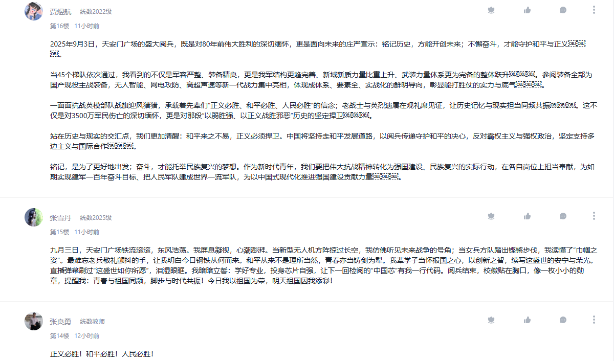 9月3日,纪念中国人民抗日战争暨世界反法西斯战争胜利80周年大会在北京隆重举行。学院把观看纪念大会和阅兵仪式作为一堂思政大课,纳入2025级新生军事训练、课堂教学、党团支部和班级的重要活动内容,并在《向学统数》学习通党建课程平台开设交流专区,师生通过各类平台观看直播盛况,引起热烈反响。