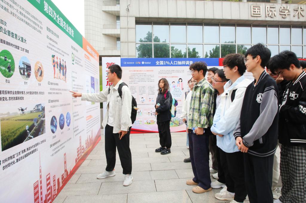 活动现场,学院以“数据赋能总体国家安全观”为主题设置了相应展区,展示“国之大者:数据安全赋能总体国家安全观”“安全护航:筑牢统计数据安全防火墙”“法治根基:《统计法》守护数据生命线”等内容;现场还设置了“红色统计史”“统计开放日沿革”“1%人口抽样调查”“第四次全国农业普查”展区,以图文并茂的形式展示统计事业的发展历程和重要成果。展区吸引了众多学生驻足观看,咨询台前专业人士与学子们进行面对面交流,现场气氛热烈,互动频繁。学生们通过现场互动,深刻体会到统计数据背后的责任与使命,纷纷表示要学好专业知识,加强实践锻炼,为统计事业长远发展注入经贸力量。