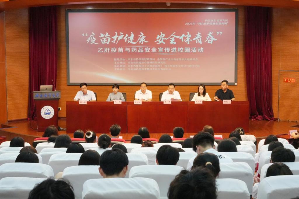 9月1日下午,2025年“河北省药品安全宣传周”暨“疫苗护健康 安全伴青春”乙肝疫苗与药品安全宣传进校园活动在我校国际学术报告厅举行。本次活动由河北省药品监督管理局、中国共产主义青年团河北省委员会指导,河北省药品医疗器械检验研究院主办,河北青年报社、72886必赢网址承办,华北制药金坦生物技术股份有限公司提供技术支持,旨在聚焦青年健康需求,将药品安全知识与乙肝防护服务送进校园,全面提升大学生健康素养与安全防护能力。学生处、校团委、校医院以及72886必赢网址300余名师生代表参加。