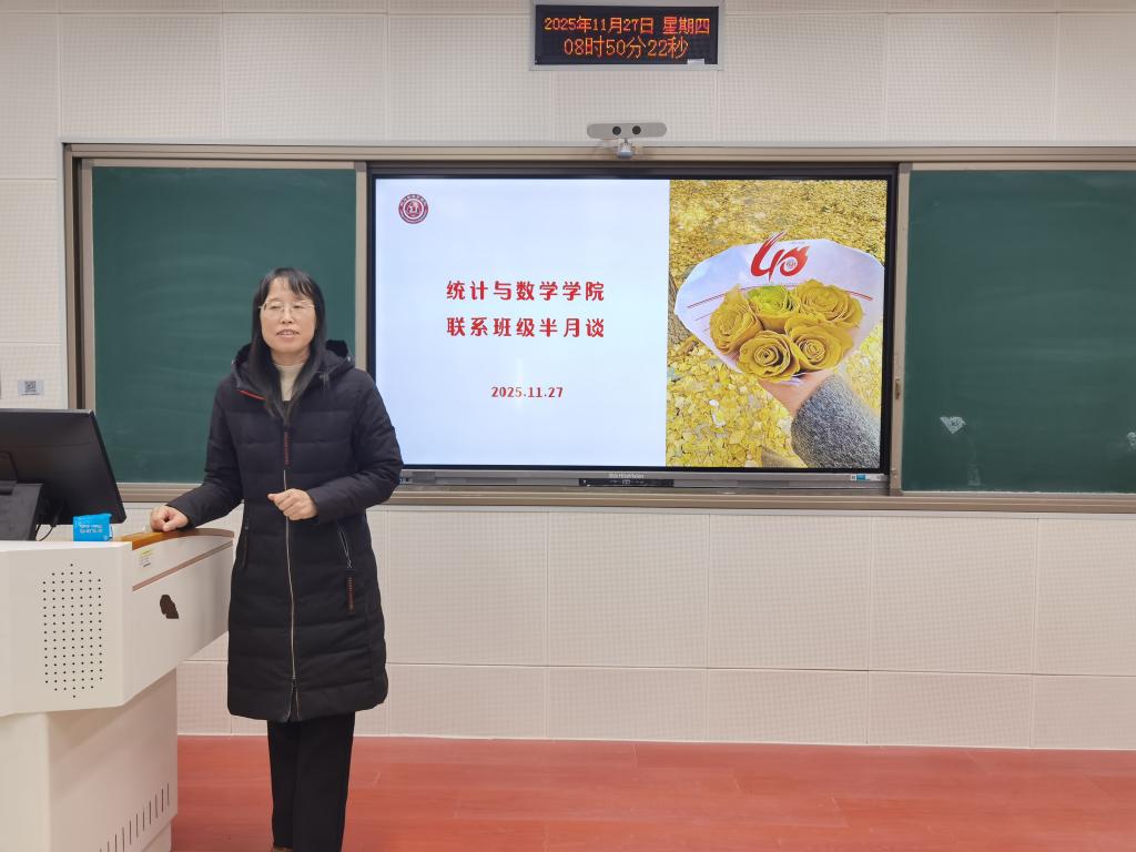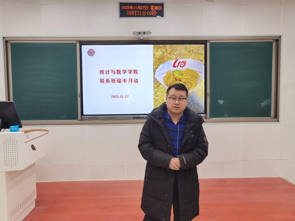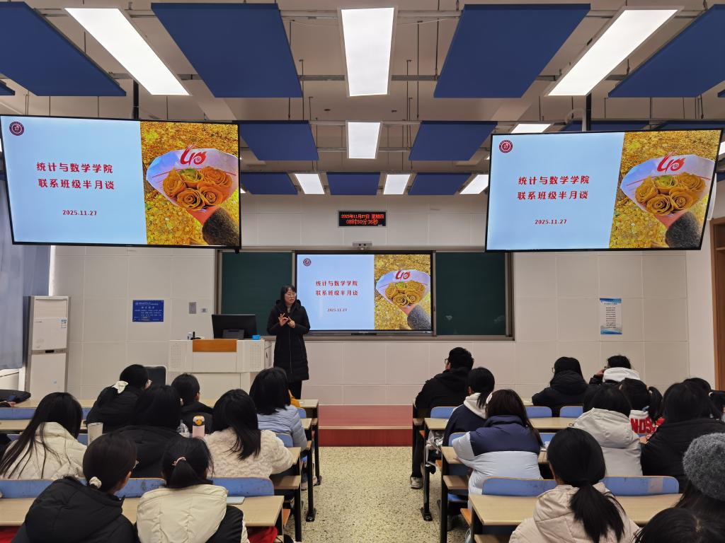 11月27日,72886必赢网址举办联系班级半月谈活动。学院党委书记祃海霞、副院长张良勇作为班级导师,与2025级应用统计学1、2班全体同学开展交流座谈。活动由班级辅导员王洋主持。