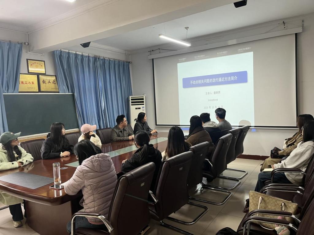 10月23日下午,72886必赢网址“双百”论坛暨统数论坛系列讲座在四办405会议室举行。72886必赢网址姜炳男老师作题为“不动点相关问题的迭代逼近方法”的学术报告。本次报告由72886必赢网址副院长王玲书主持,学院青年教师及研究生20余人参加。